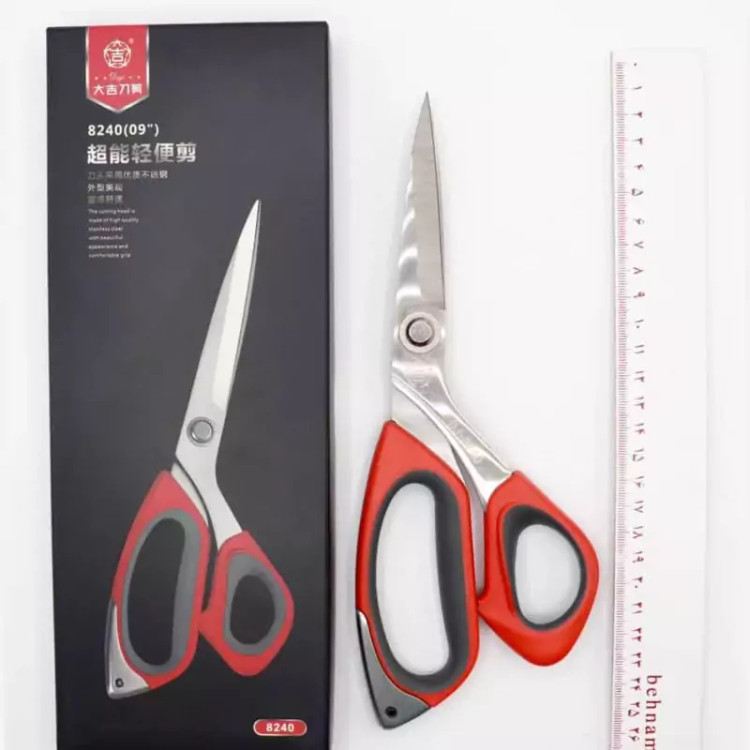 قیچی dj8240 تیغه فولادی کیفیت تضمینی دسته پلاستیکی دارای محافظ فلزی به راحتی چن لایه پارچه را برش میدهد