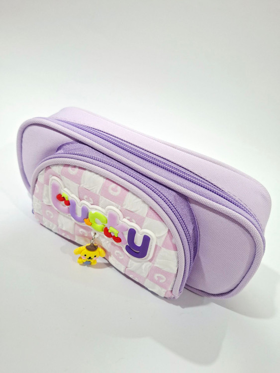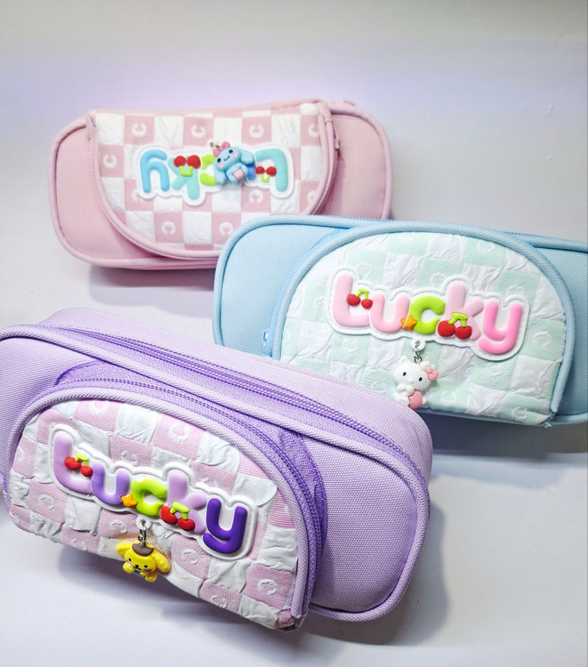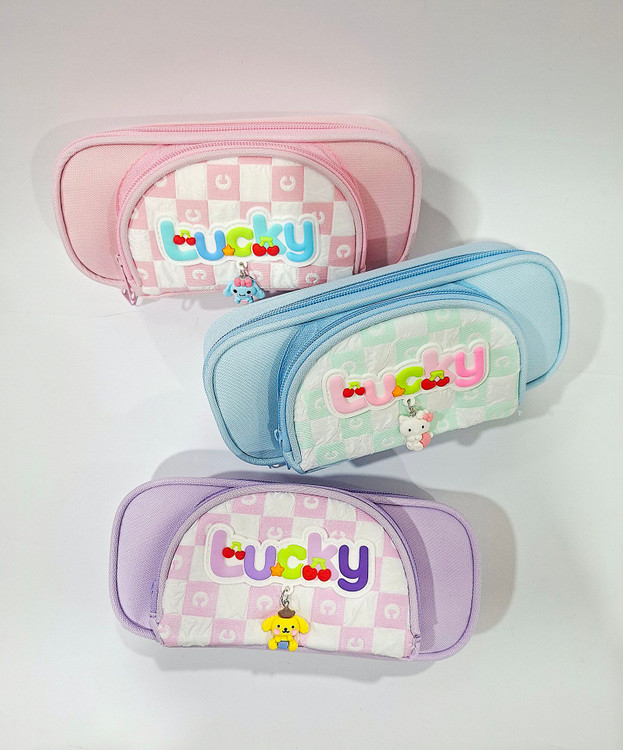 جامدادی پارچه ای طرح چهار خانه ما با آویز کوچک عروسکی دارای یک جیب اصلی بزرگ ویک جیب کوچکتر در جلو است ک با زیپ بسته میشوند