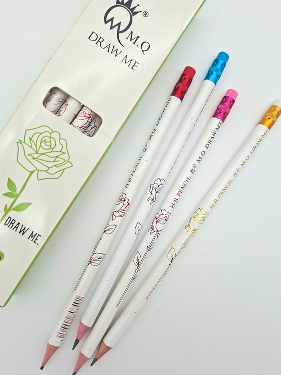 طرح روی مداد: هر مداد با یک طرح منحصربهفرد گل رز در رنگهای مختلف حکاکی شده (قرمز، صورتی، بنفش، طلایی و غیره) – مثل یک اثر هنری کوچک روی مداد!
