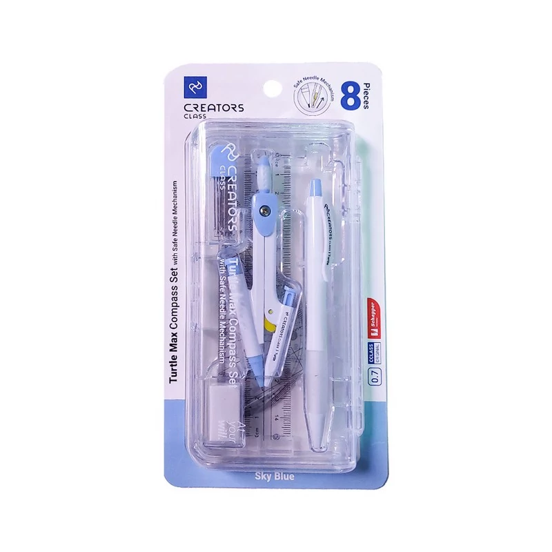 ست 8 عددی پرگار سی کلاس مدل ترتل مکس C.CLASS TURTLE MAX در 4 رنگ مشکی ، آبی ، صورتی و سفید شامل تراش ، پاکن ، دو عدد گونیا ، نقاله ، خط کش ، پرگار اتودی ، اتود و مغز جعبه نگهدارنده : برای حمل و نگهداری آسان ابزارها. دقت بالا: طراحی دقیق برای ایجاد دایرهها و خطوط صاف راحتی در استفاده: طراحی ارگونومیک که به کاربران اجازه میدهد به راحتی از آن استفاده کنند. رسم اشکال هندسی: برای درسهای ریاضی و هنر آموزش مفاهیم هندسی: کمک به درک بهتر مفاهیم هندسی و اندازهگیری